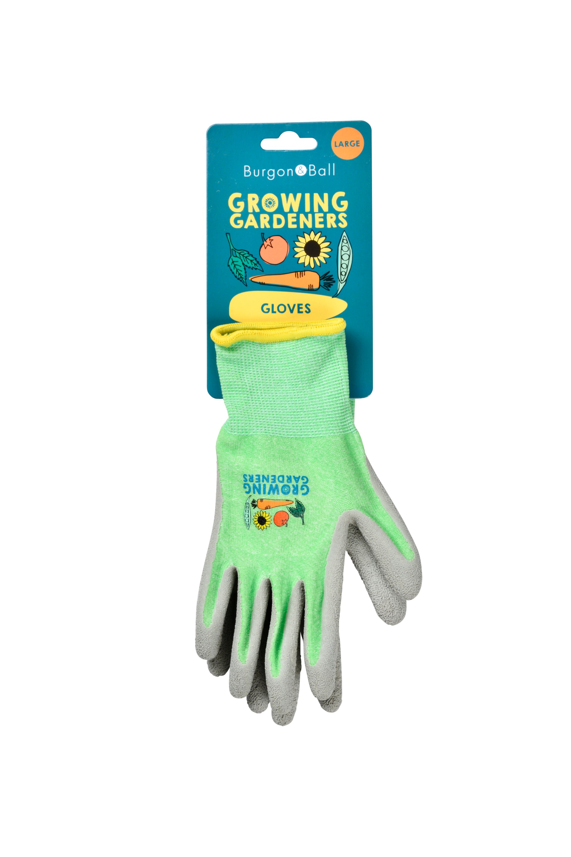 The gloves have a FSC©-certified latex coating on palm and fingers which offers enhanced grip and protection against dirt and moisture. The comfortable stretch fabric ensures a snug fit, and the cheery Growing Gardeners logo on the back of the hand adds a splash of colour.