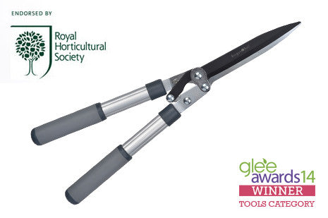 High performance hedge shear with unique compound action delivers superior cutting power on thick stems.