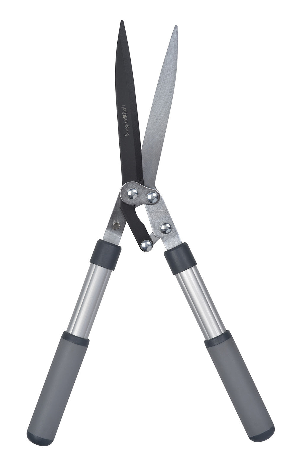 High performance hedge shear with unique compound action delivers superior cutting power on thick stems.