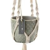 Macramé (decorative knotted cord or string) is once again the height of fashion and is a must-have accessory for every stylish home. This unusual knotted hanger holds a subtly-textured glazed pot in a soft grey green with a lovely crackle glaze, a neutral go-anywhere colour which will look just right all around the home. The hanging macramé pot is a classic boho style statement and looks beautiful with a trailing plant spilling from it.