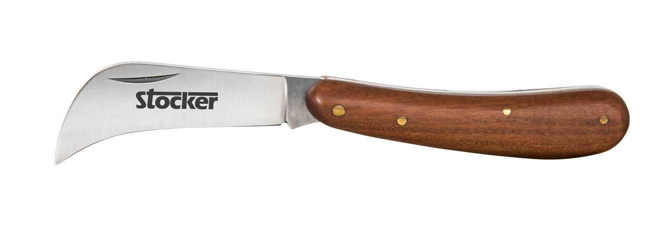 En universal podekniv til poding av busker, trær og frukttrær. Knivbladet buet og er laget av karbonstål slik at det er lettere å få et fint snitt. Håndtaket er i tre.